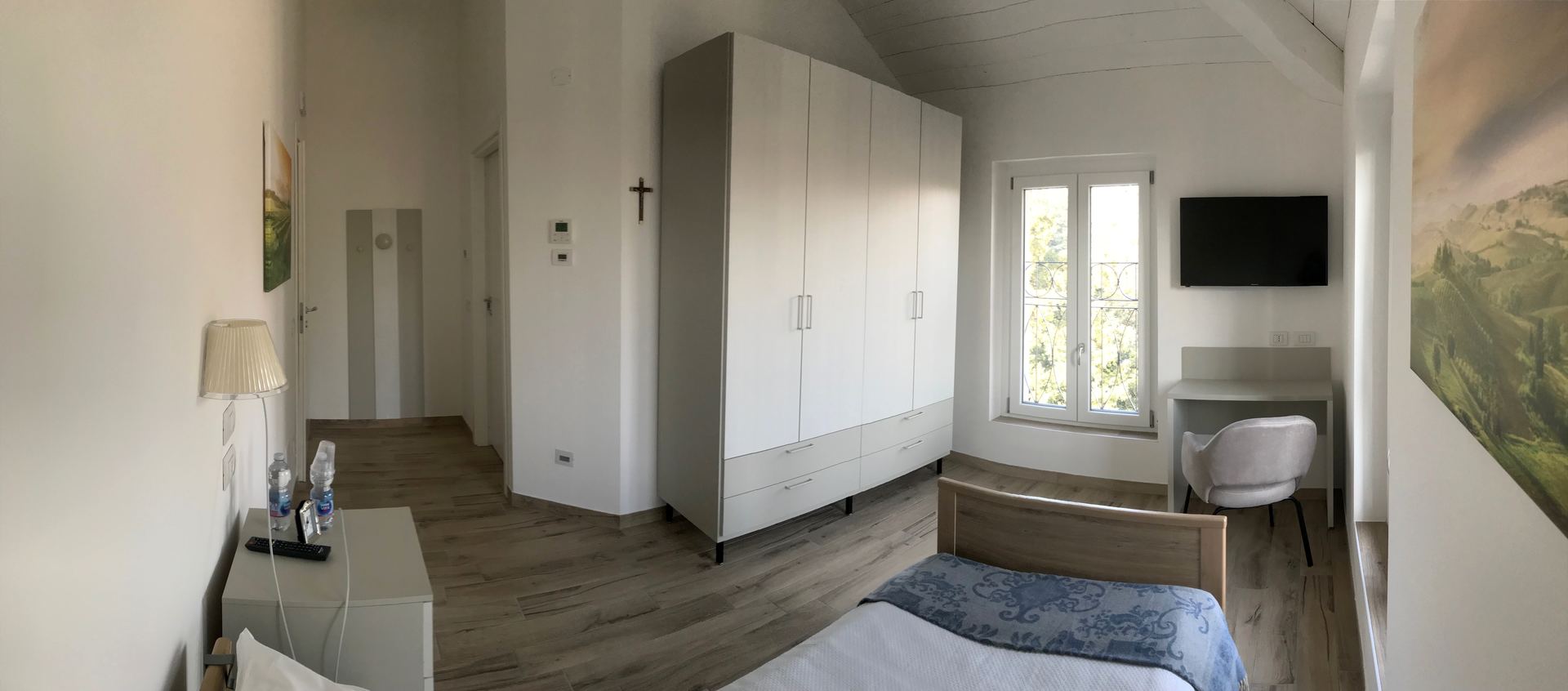 - Alloggio in camera singola o doppia dotata di bagno, pulsante di chiamata infermiera, armadio, comodino con cassettiera, letto a 1 piazza, televisore